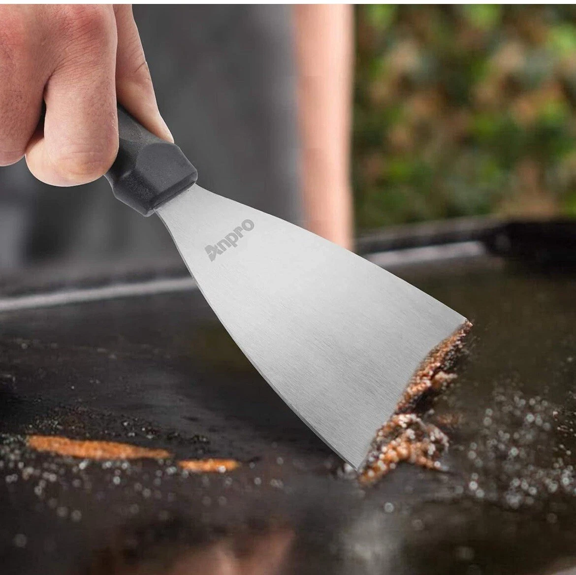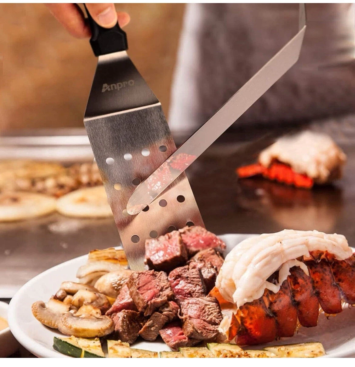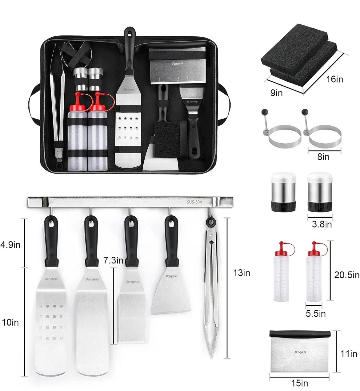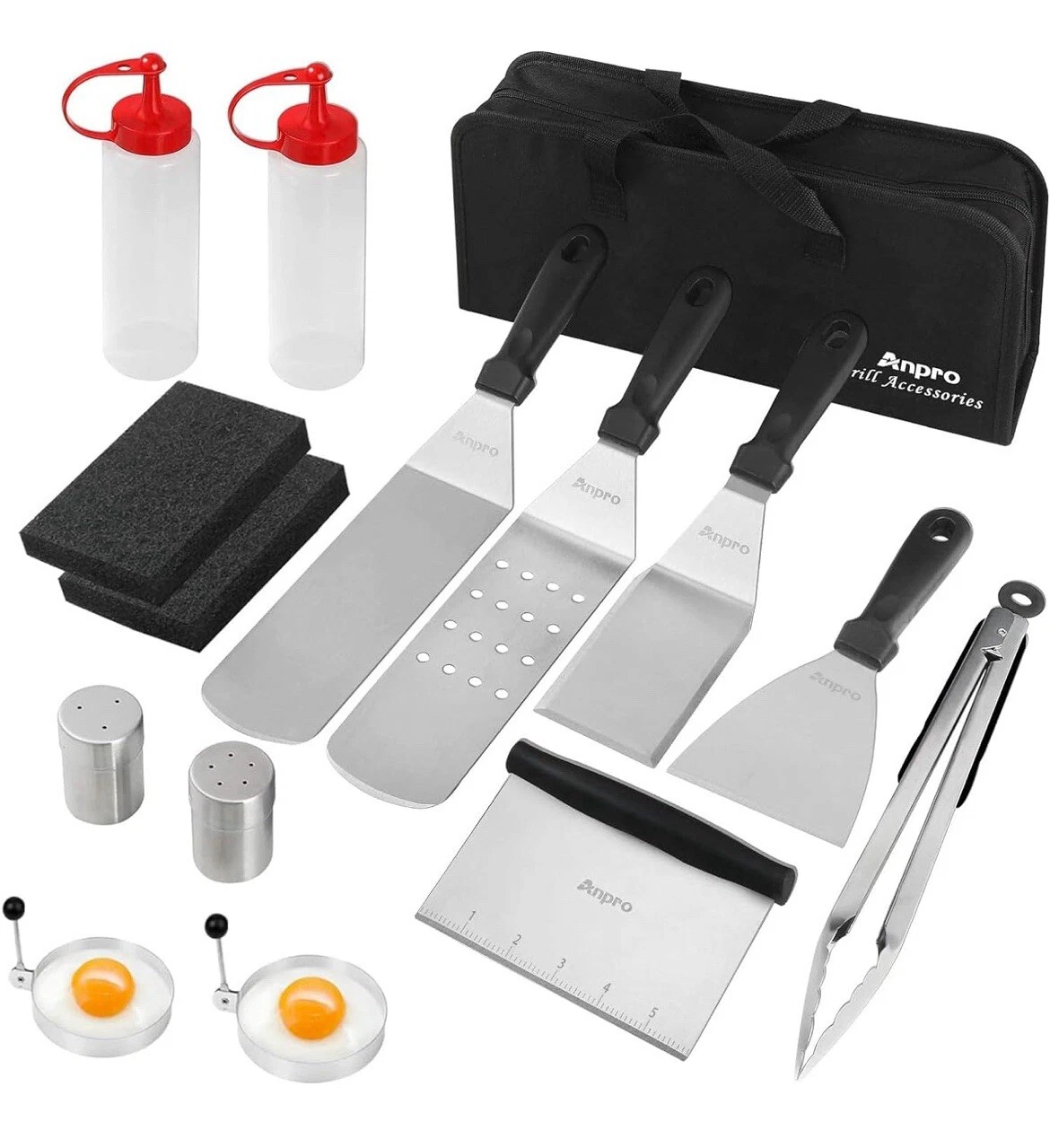 This Anpro Griddle Accessories set includes 15 pieces of high-quality griddle accessories that will make your outdoor cooking experience more enjoyable. The set features a variety of items, including a grill set, all made with durable materials such as silicone and stainless steel.