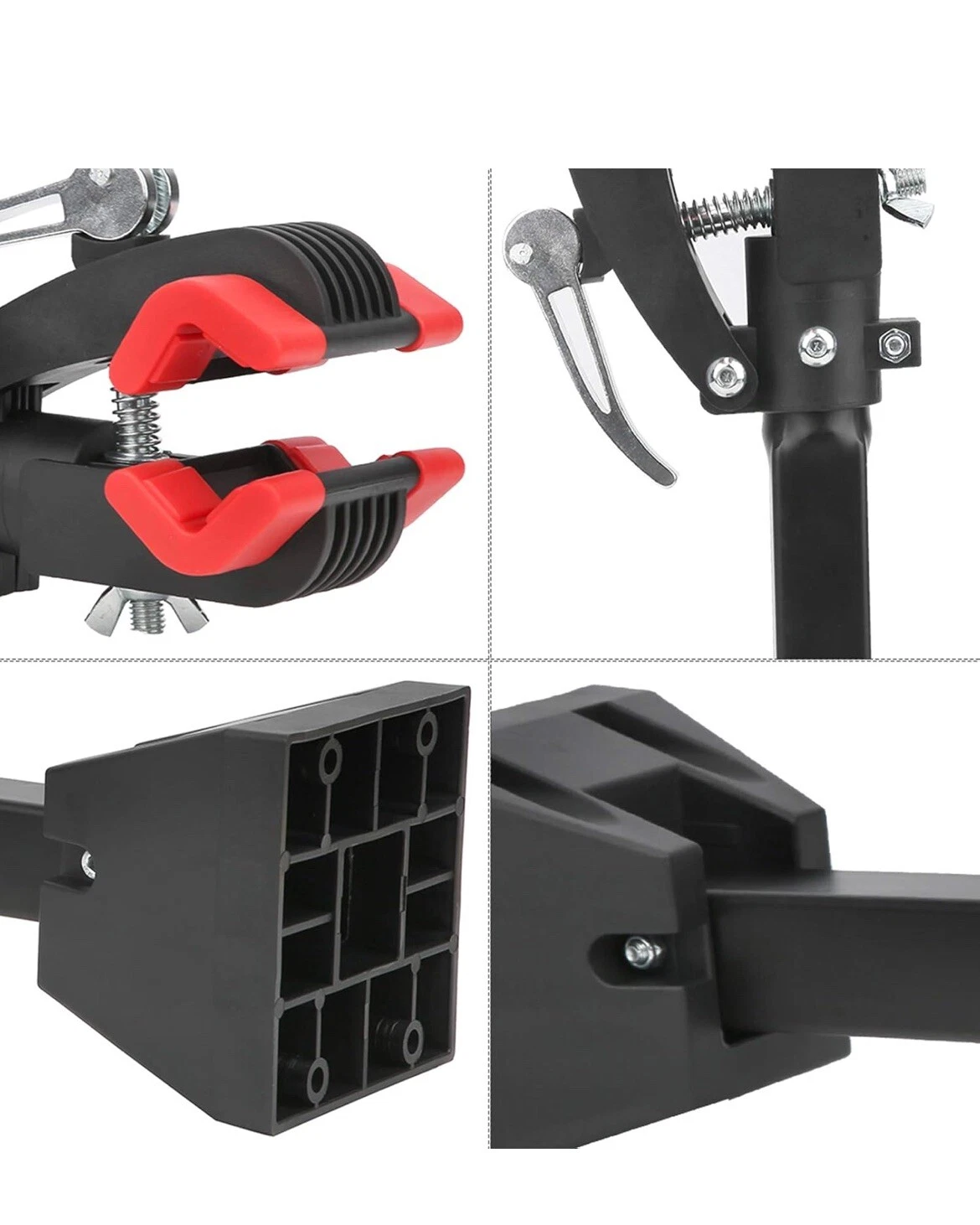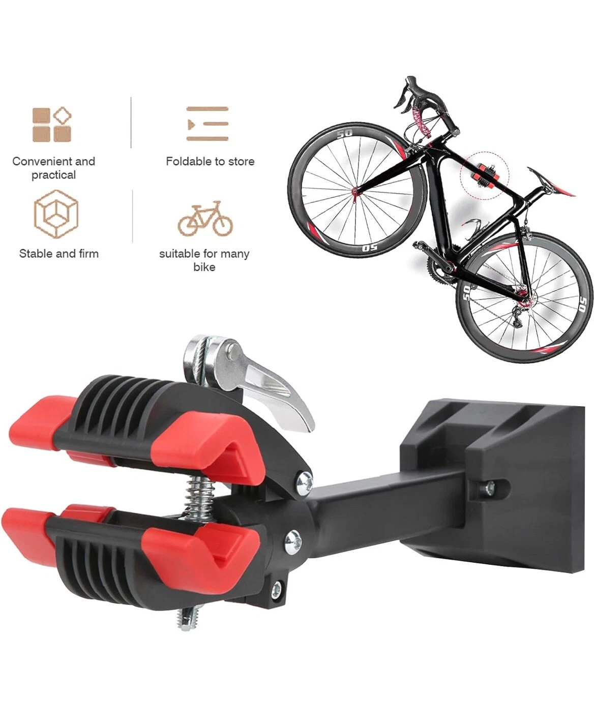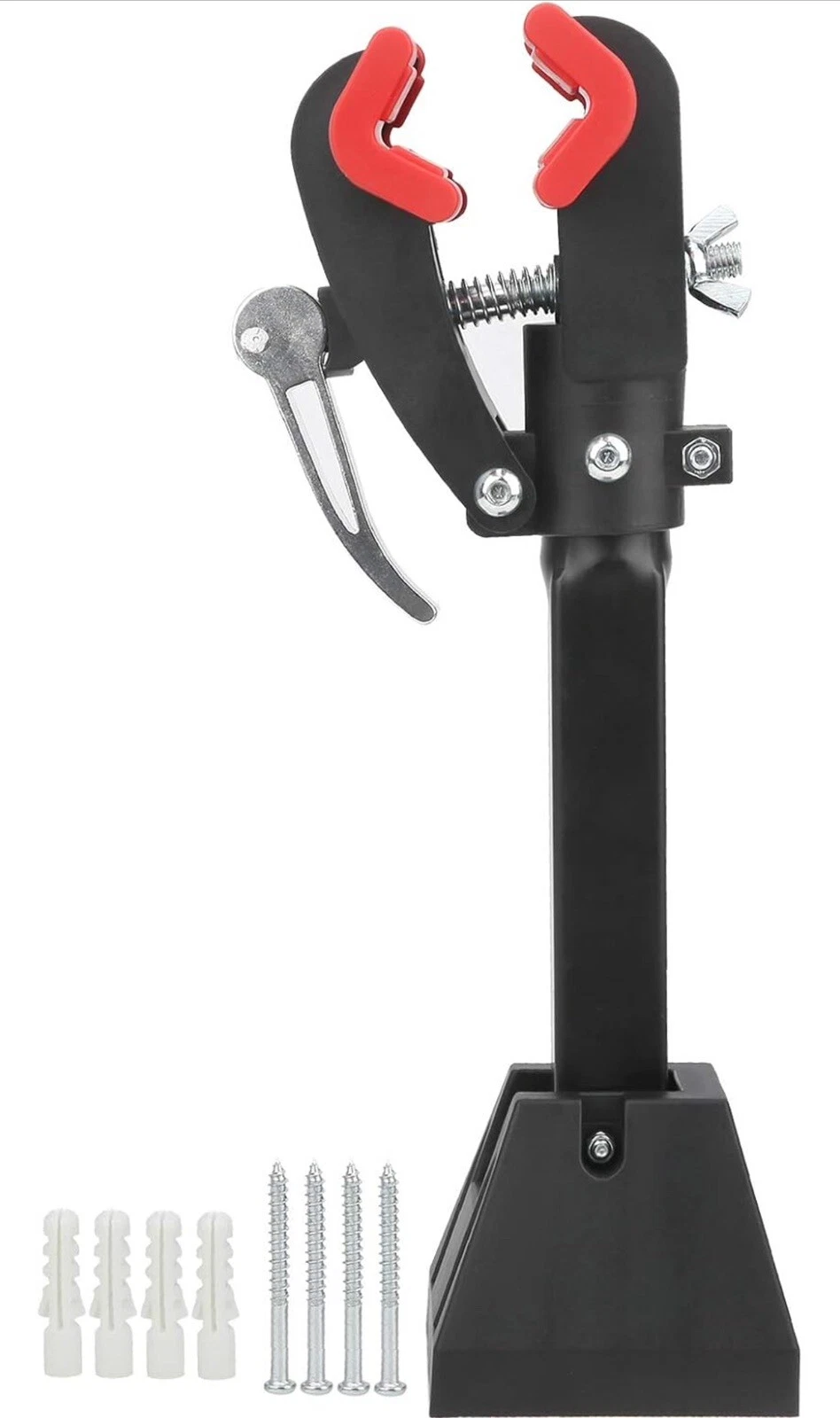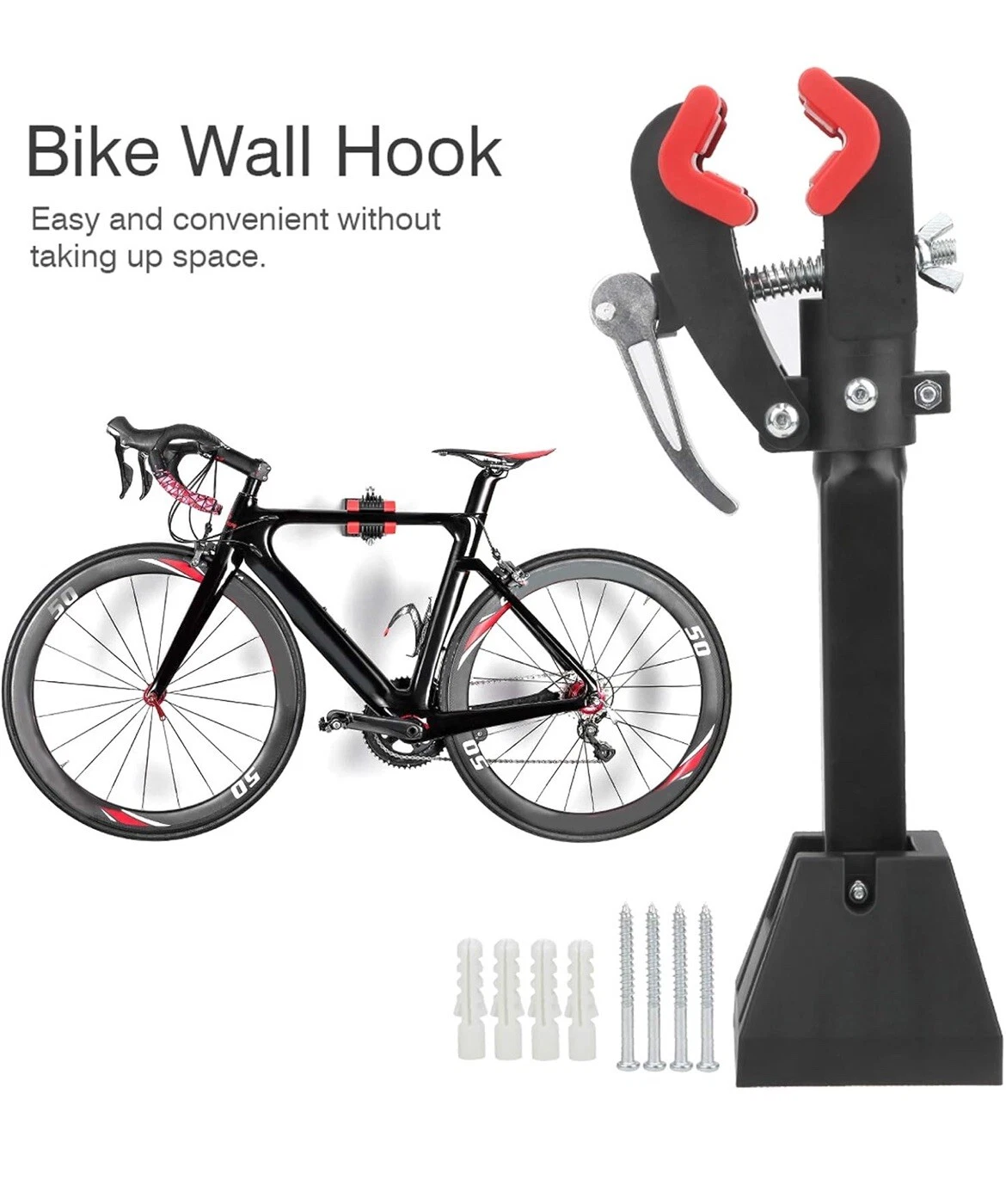 The CX-11 Bike Wall Hook Hanger is a black metal bike repair stand designed by Pro Bike Tool. It has a maximum load capacity of 34 kg and can hold one bike securely in place. The unit is wall-mounted and has a height of 15 inches, making it ideal for indoor bike storage in garages or other spaces. This bike rack is a convenient and space-saving solution for storing and working on your bicycle.